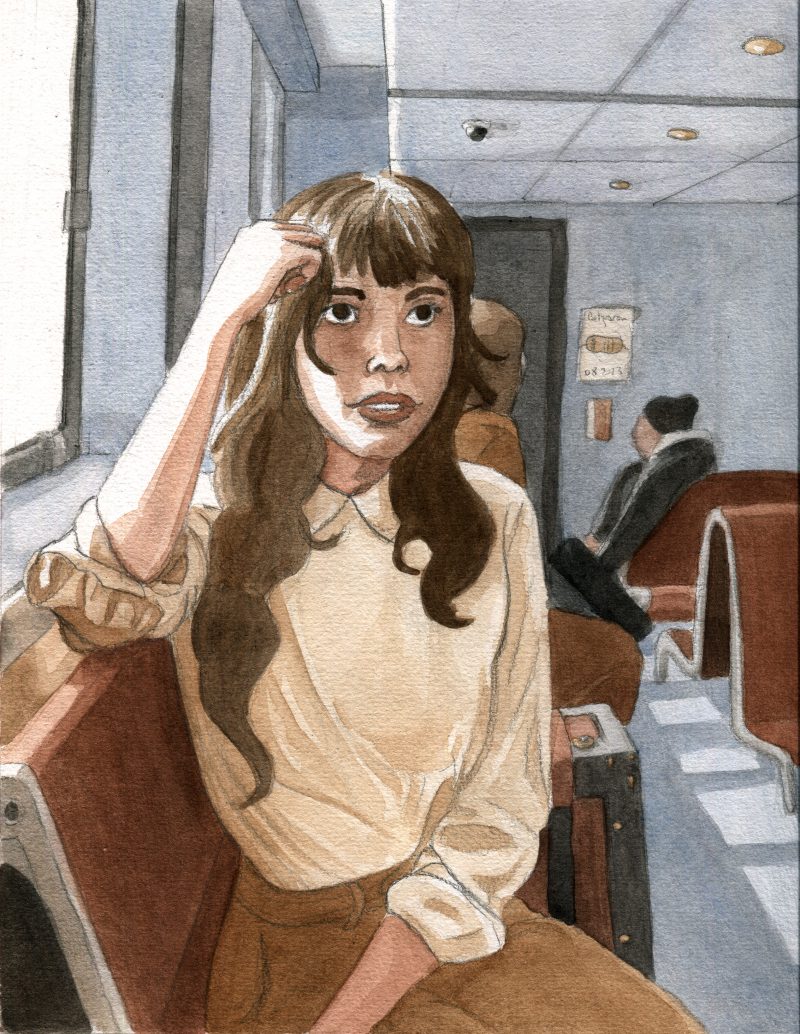 Katelyn Katelyn, aquarelle & crayon, 30×24 cm Un portrait un peur différent cette fois-ci. Davantage de corps, un visage plus petit et un décor. J’aime bien, cela enrichit la narration. Avec le making of inclus !